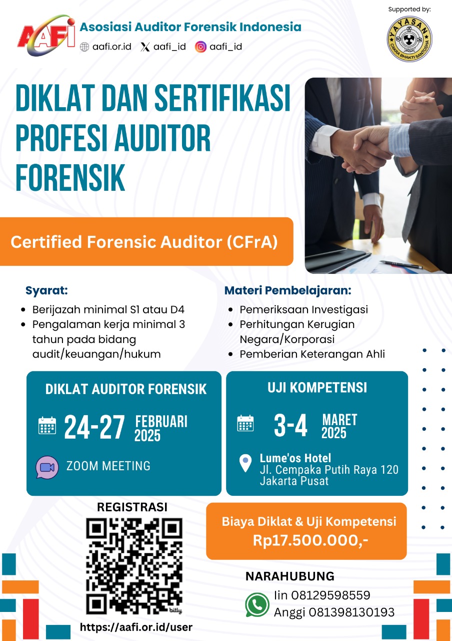 Asosiasi Auditor Forensik Indonesia Yiluweneri (AAFI YILUWENERI), dengan dukungan dari Yayasan Cakra Bhakti Santosha, kembali mengadakan Diklat dan Sertifikasi Profesi Auditor Forensik dengan gelar Certified Forensic Auditor (CFrA). Program ini bertujuan untuk meningkatkan kompetensi para auditor dalam bidang audit investigatif dan forensik guna mendukung upaya pemberantasan tindak pidana keuangan dan korupsi.