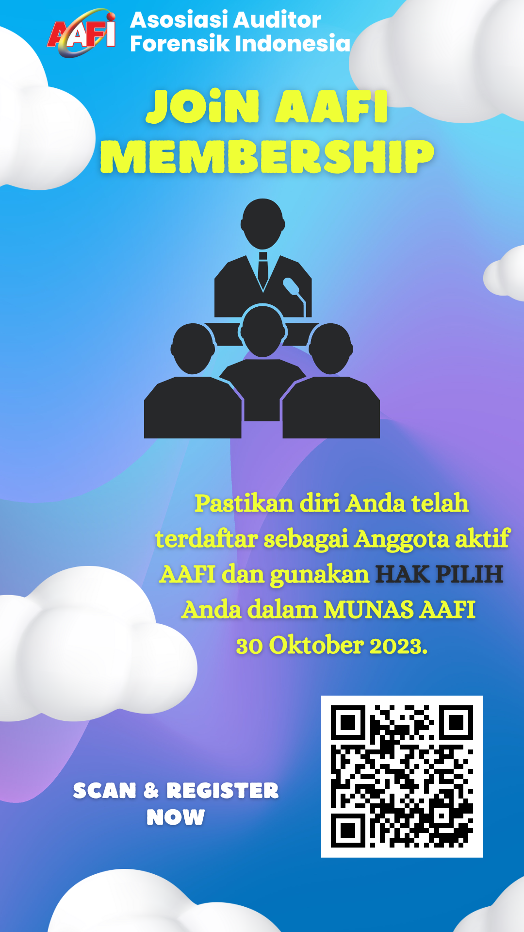 Asosiasi Forensik Auditor Indonesia (AAFI YILUWENERI) mengundang Bapak/Ibu Anggota Aktif AAFI YILUWENERI untuk melakukan pendaftaran Musyawarah Nasional (MUNAS) AAFI YILUWENERI yang direncanakan akan dilaksanakan pada 30 Oktober 2023. Silakan melakukan pendaftaran di website AAFI YILUWENERI dengan alamat www.aafiyiluweneri.org/2023. Jangan lupa siapkan Sertifikat Certified Forensic Auditor (CFrA) dan Bukti Iuran Tahunan AAFI YILUWENERI saat pendaftaran.