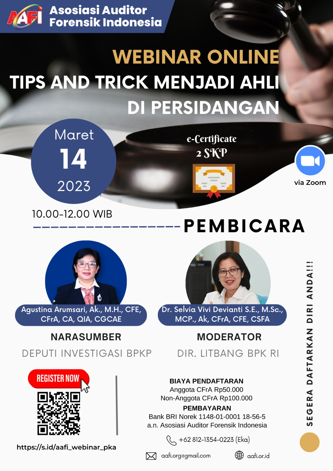 Asosiasi Forensik Auditor Indonesia (AAFI YILUWENERI) mengundang Bapak/Ibu dalam Webinar Online dengan Tema "TIPS AND TRICKS MENJADI AHLI DI PERSIDANGAN"